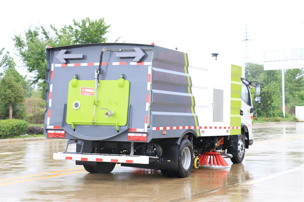 高效洗掃車利用高壓水流及傾斜掃刷將垃圾掃**吸盤前面,在風機產生的負壓作業下,風流在閉合的回路中將垃圾吸入垃圾箱中貯存,整個作業過程均是物理原理,不會產生化學廢料或垃圾外泄對環境的二次污染,同時,后噴霧的降塵有效的降低了空氣中粉塵濃度,解決粉塵污染問題。