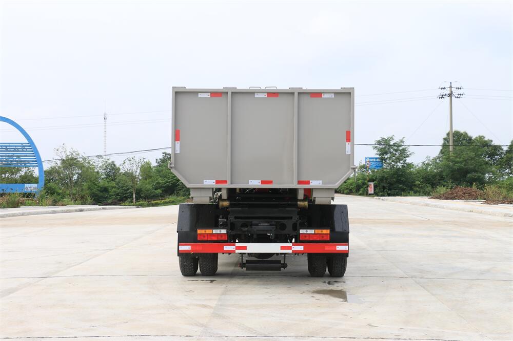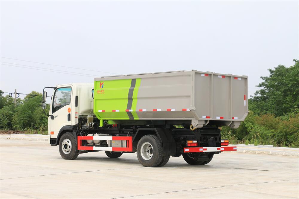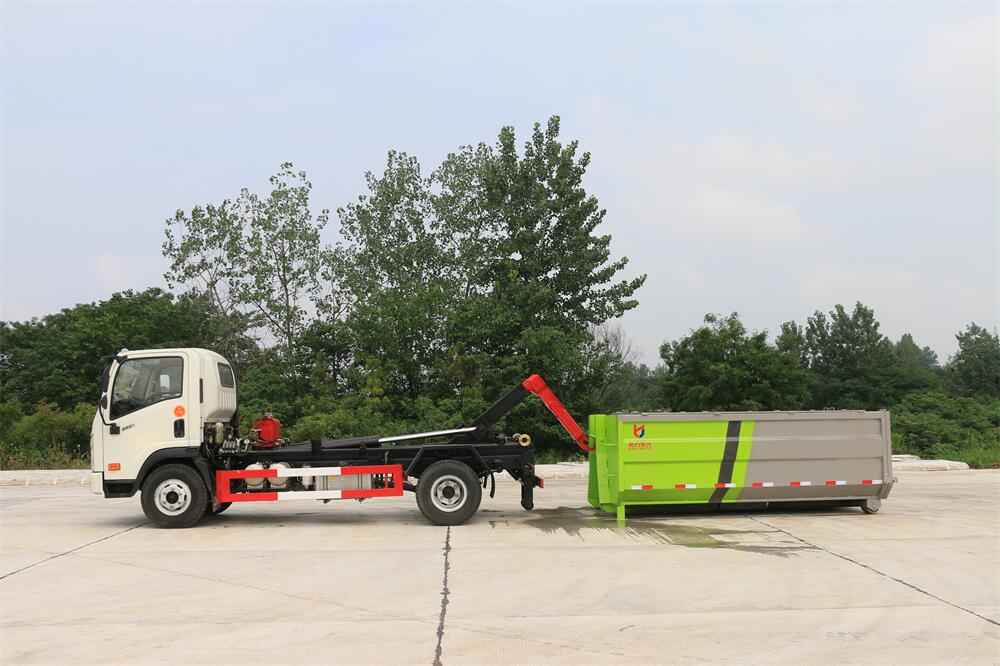 該款鉤臂式垃圾車由液壓系統、操作系統組成。舉升油制缸(1支)系國內知名液壓件廠家生產的雙作用油缸。垃圾廂可自吊上放下,可自行傾倒垃圾,上下一次工作循環時間≤50S。該車的特點是一個車能配多個垃圾廂,能實現一臺車與多個垃圾廂聯合作業,循環運輸,充分提高了車輛的運輸能力。