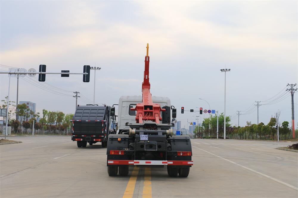 該款鉤臂式垃圾車由液壓系統、操作系統組成。舉升油制缸(1支)系國內知名液壓件廠家生產的雙作用油缸。垃圾廂可自吊上放下,可自行傾倒垃圾,上下一次工作循環時間≤50S。該車的特點是一個車能配多個垃圾廂,能實現一臺車與多個垃圾廂聯合作業,循環運輸,充分提高了車輛的運輸能力。
