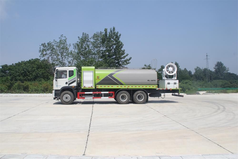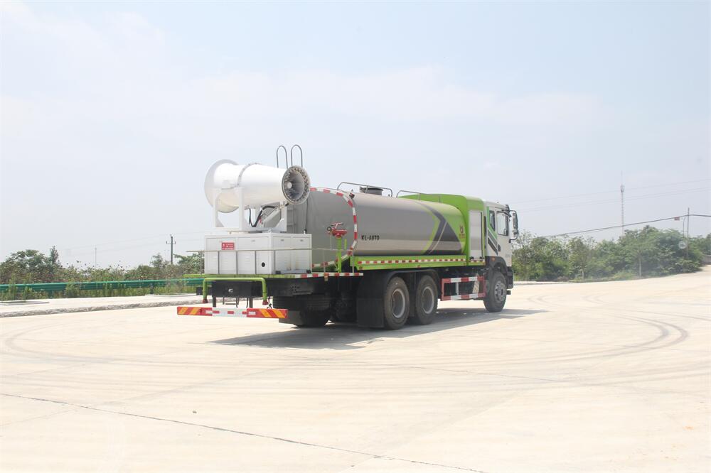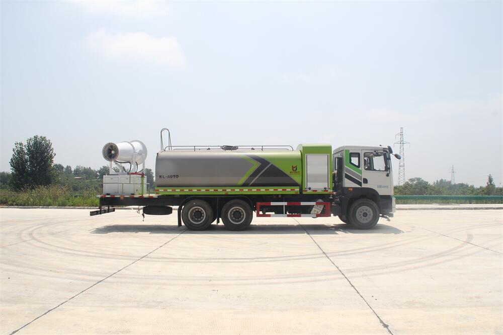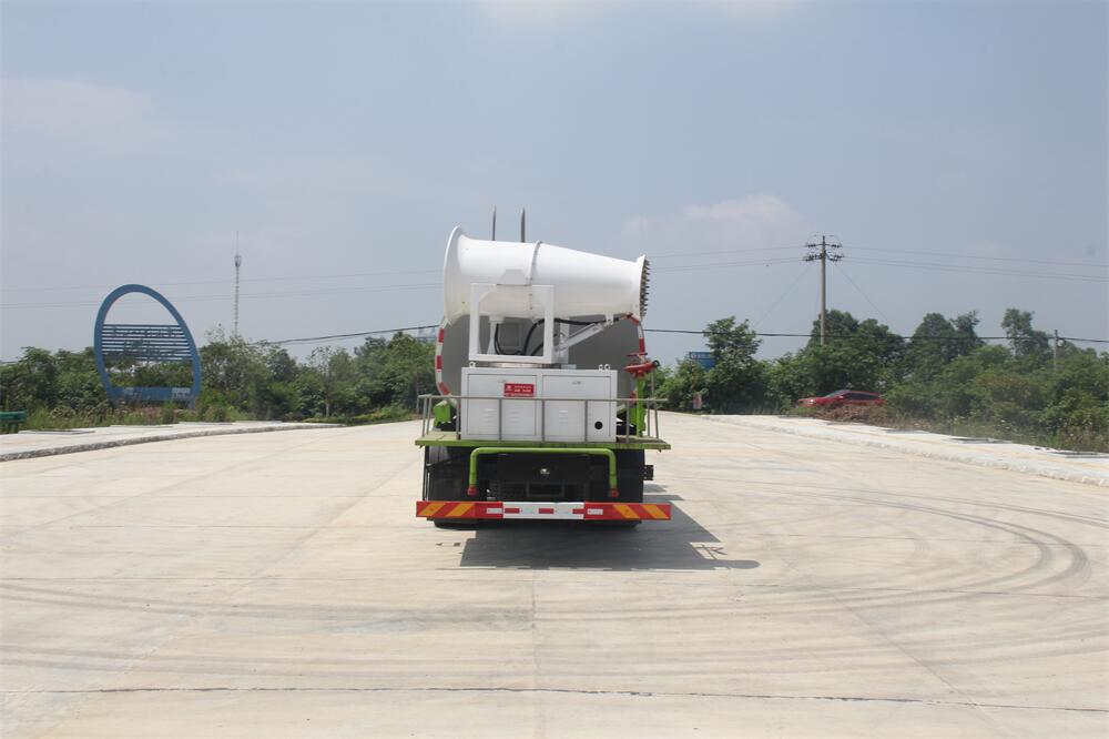 上裝配置:罐體容積為 16立方,選配風送式霧炮機組射程30米、40米、50米、60米、80米、100米、120米霧炮,罐體鋼板為4mm碳鋼Q235材質,罐內隔板具有防波作用,以減輕汽車行駛時罐體液體沖擊,罐體及整車外形尺寸按照公告。帶大功率專用灑水泵,泵可自吸自排,整車前沖、后灑、側噴、帶65消防接口,后平臺配CLW-50、CLW-60、CLW-80、CLW-100、CLW-120型風送式霧炮機組;罐體前封頭配大功率柴油發電機組;前封頭帶水位計,后平臺主管路帶1寸澆花接口,后爬梯。帶兩根輸水管及陰陽端。罐體顏色:銀/灰/綠,罐體兩側噴“多功能抑塵車”字樣,貼反光標示。