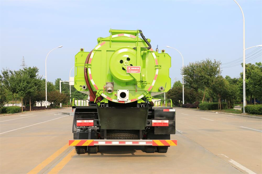 上裝配置:上裝配置:水罐4 立方,污罐 8立方;清洗 部份采用天津通潔,壓力 24Mpa,流量 215L/min,配80米直徑22高壓管帶液壓卷盤(pán); 吸污部份采用山東 SK-15 水循環(huán)泵(億豐 10T 雙聯(lián)想真空泵),吸污罐帶舉升,后蓋液壓開(kāi) 啟,帶一個(gè) 600mm 快開(kāi),罐體后尾部一個(gè) DN150 排污口球閥,一個(gè) DN100 進(jìn)污口球閥,一個(gè)視 污窗,一根 10m 吸污管,一套陰陽(yáng)端,壓力 表,防溢閥,箭頭燈,淋管裝置,高壓泵帶氣 吹水。配一個(gè) 4.5 公斤水雷噴頭,另帶一個(gè) 80 公分手持洗車(chē)噴頭。
