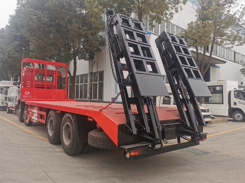 其他備注:該車專用裝置為平板,用于工程機械和一些不可拆卸貨物的長途運輸.防護材料:Q235碳鋼,連接方式:左右側面與平板縱梁采用焊接連接, 后部防護與車架采用焊接連接,后部防護斷面尺寸(mm):50×120,后部防護離地高度(mm):490;隨底盤選裝同系列駕駛室、遮陽罩及保險杠,選裝不同樣式的爬梯.ABS系統生產廠家及型號為:廣州市科密汽車制動技術開發有限公司/CM4XL-4S/4K(4S/4M), 西安正昌電子有限責任公司/ZQFB-V, 浙江萬安科技股份有限公司/VIE ABS-Ⅱ;安裝具有衛星定位功能的行駛記錄儀.發動機WP12.375E50 對應的油耗值為:40.48。整車長/軸距/后懸對應關系為(mm):11900/1800+4575+1400/2600,11300/1800+3975+1400/2600,10900/1800+3575+1400/2600,10400/1800+3000+1400/2675.選裝不同樣式的爬梯結構。